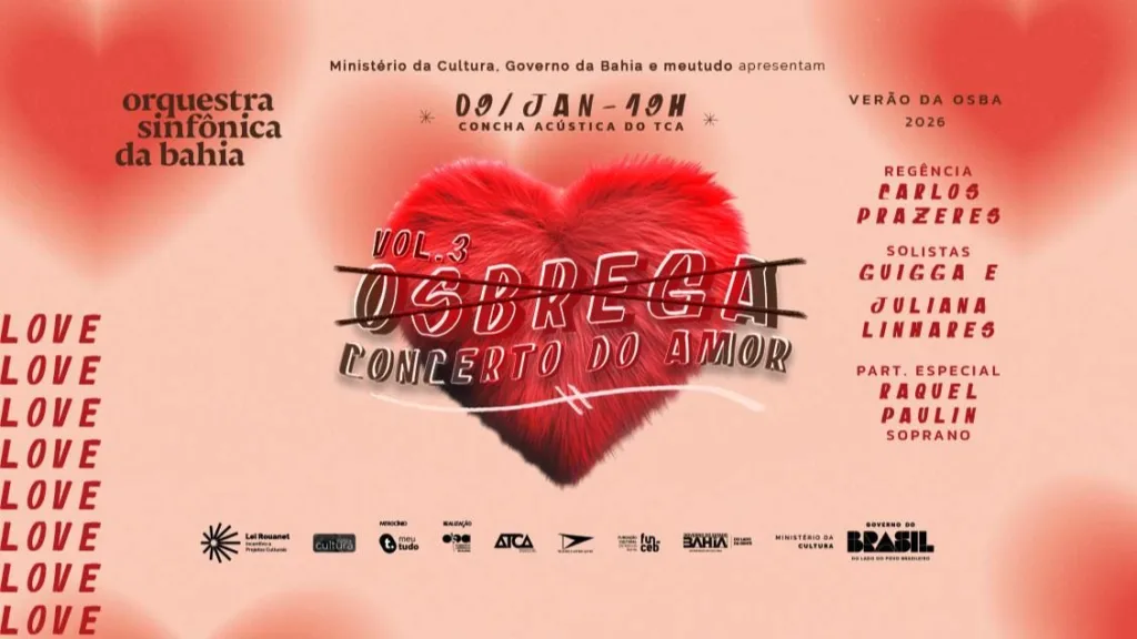 Salvador vive, nesta quinta-feira, 9 de janeiro, uma noite especial dedicada à música brasileira. A Orquestra Sinfônica da Bahia (OSBA) apresenta, às 19h, na Concha Acústica do Teatro Castro Alves, a terceira edição do espetáculo “OSBREGA – Concerto do Amor”, reunindo clássicos da música romântica brasileira em versões sinfônicas. Entre os destaques da noite está a participação do cantor maracaense Guigga, que sobe ao palco ao lado de grandes nomes da música nacional.